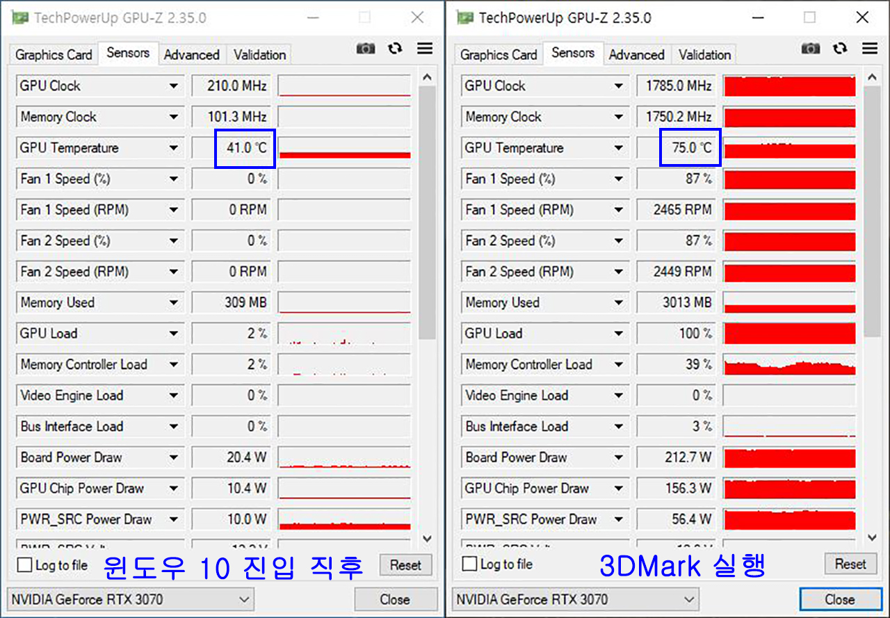 윈도우 10 화면에 진입한 후 아무 작업도 하지 않는 상태(GPU 유휴 상태)에서는 41°C 내외를 유지하였고, 그래픽 벤치마크(하드웨어 성능 측정 프로그램)인 3DMark에서 타임 스파이 익스트림(Time Spy Extreme) 테스트를 40분 연속으로 실행 시(GPU 100% 사용 상태)에는 75°C 내외를 유지하였다.