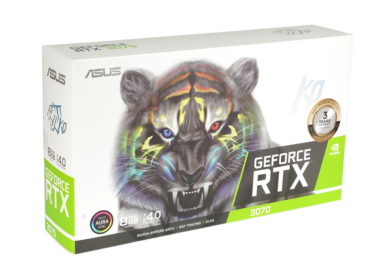 에이수스 KO 지포스 RTX 3070 게이밍에는 엔비디아의 암페어(Ampere) 아키텍처와 8nm(나노미터) 공정으로 만든 지포스 RTX 3070 GPU(GA104-300-A1)가 장착되었다.