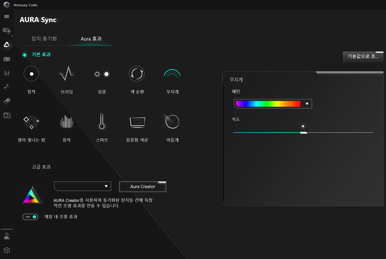 LED 색상을 바꾸거나 점등 방식을 변경하고 싶다면 에이수스 홈페이지에서 제공하는 '아모리 크레이트'(Armoury Crate) 유틸리티를 이용하면 된다. '아우라 싱크'(AURA Sync) 항목으로 이동하면 LED 제어 항목이 나타난다.