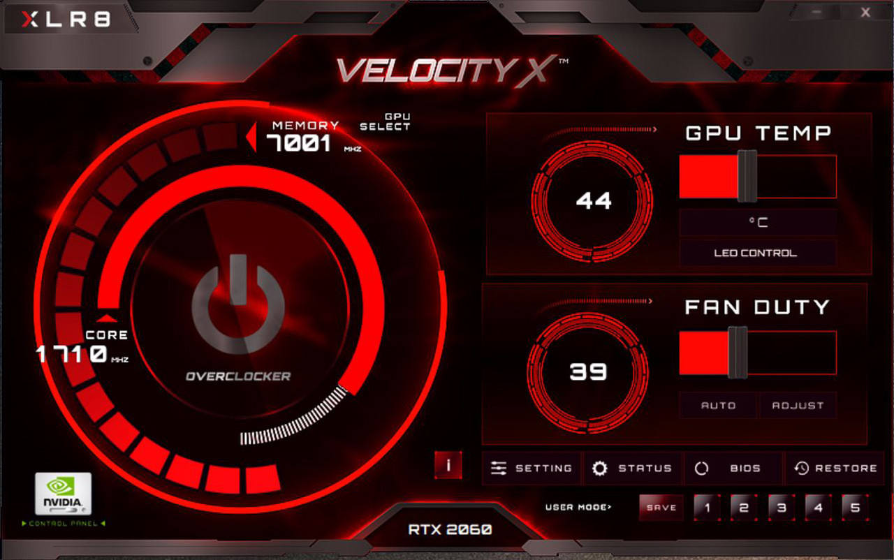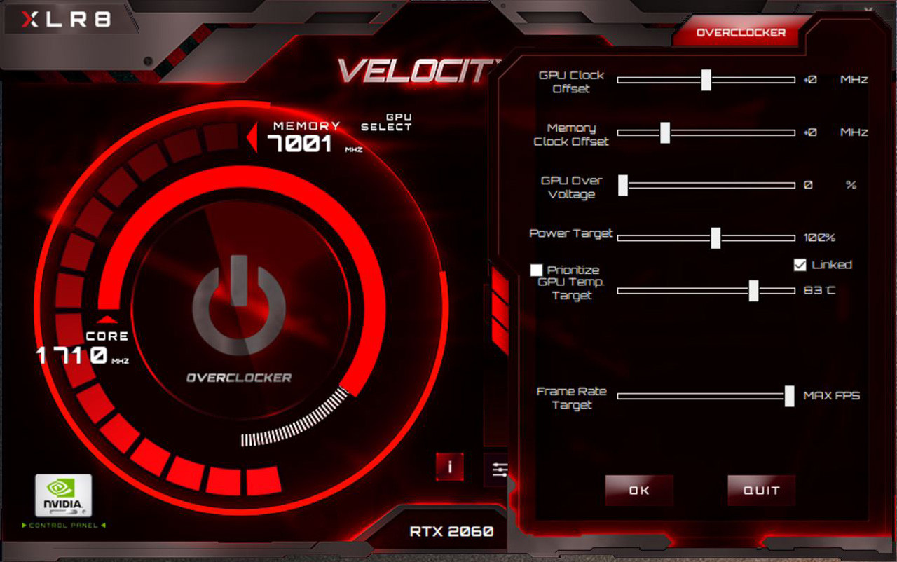 XLR8 그래픽카드 사용자들은 PNY 홈페이지에서 전용 유틸리티인 ‘VELOCITY X’(이하 벨로시티 X)를 다운로드할 수 있다. 벨로시티 X를 실행하면 실시간으로 GPU와 메모리 클럭, GPU 온도, 쿨링팬 작동 속도 등 주요 정보를 확인하는 것이 가능하다.