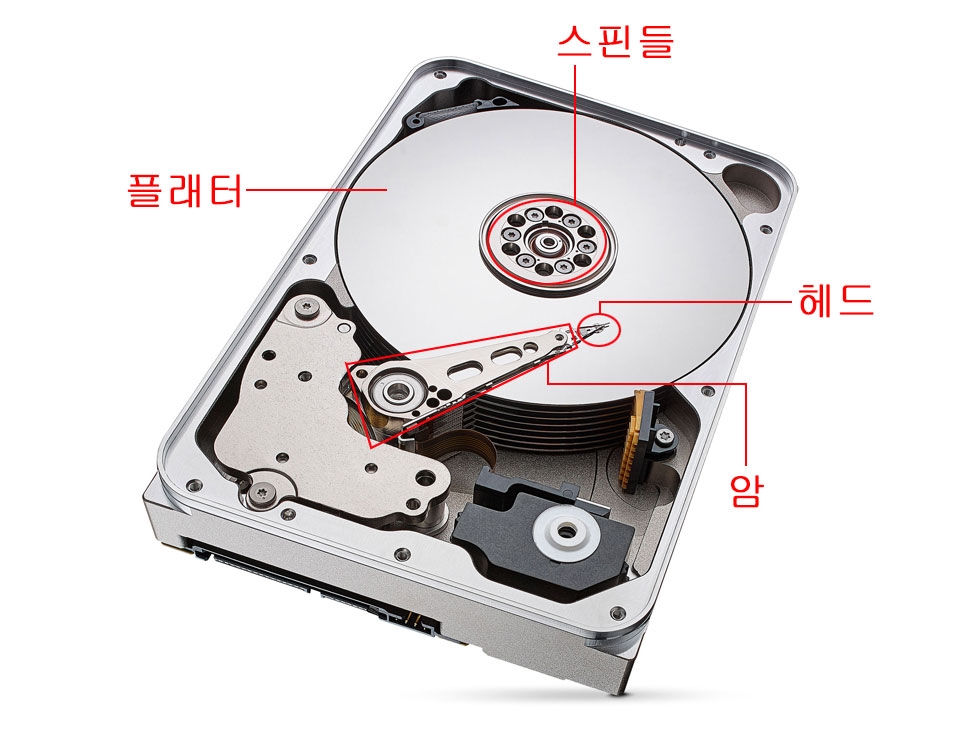 HDD는 내부에 장착된 플래터(platter)라는 원판에 데이터를 기록한다. 플래터 중앙에 있는 모터인 스핀들(spindle)로 플래터를 회전시키고 기계 팔인 암(arm)을 이용해 뾰족한 바늘 같은 헤드(head)를 플래터 위에서 특정한 위치로 옮겨서 데이터를 읽고 기록한다.